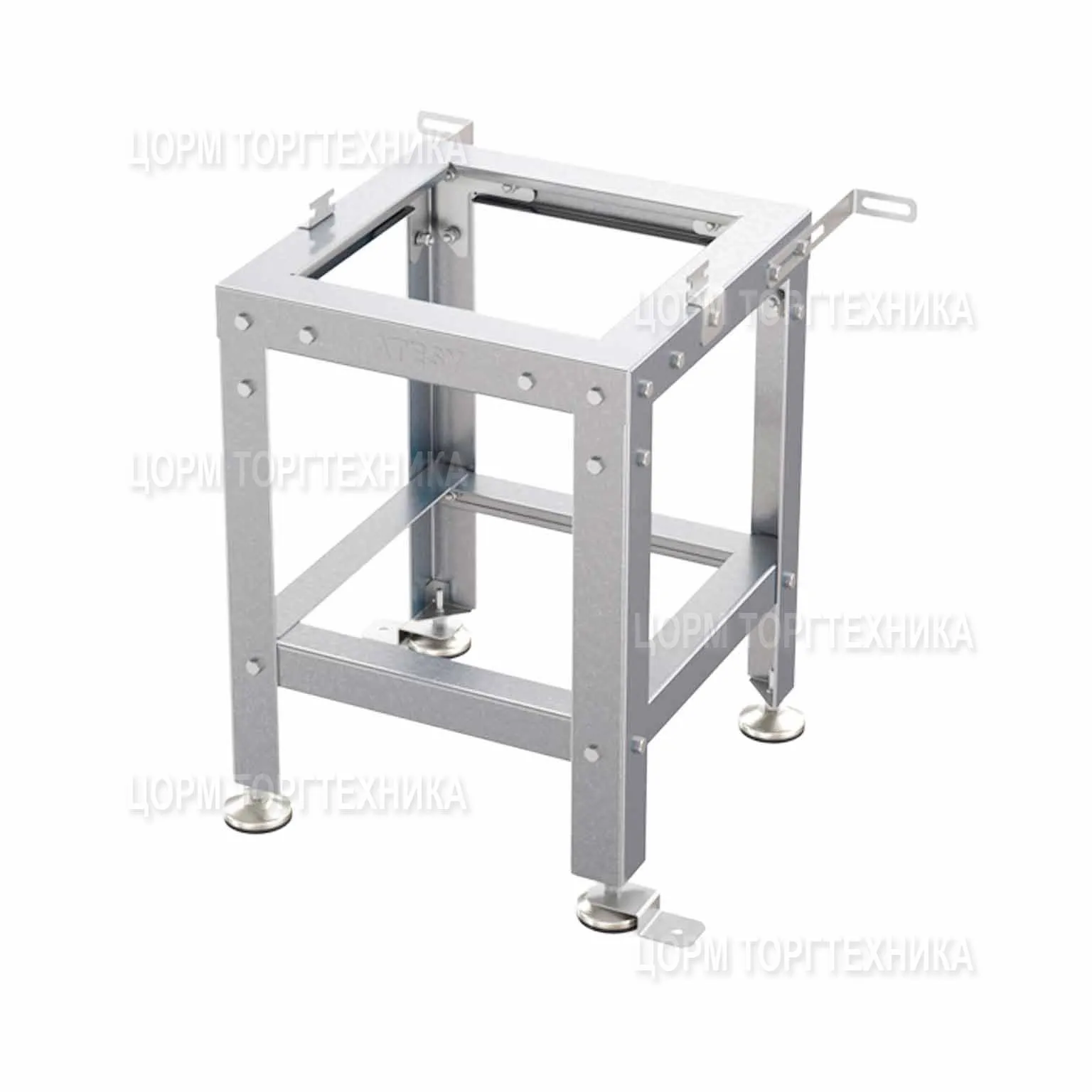 Стойки каркаса представляют собой уголок с фальцованными краями для увеличения жесткости конструкции и исключения травмоопасности. Опорные ножки регулируются по высоте в пределах 20 мм и изготовлены из нержавеющей стали с пластиковой подложкой снизу для предотвращения повреждения пола.