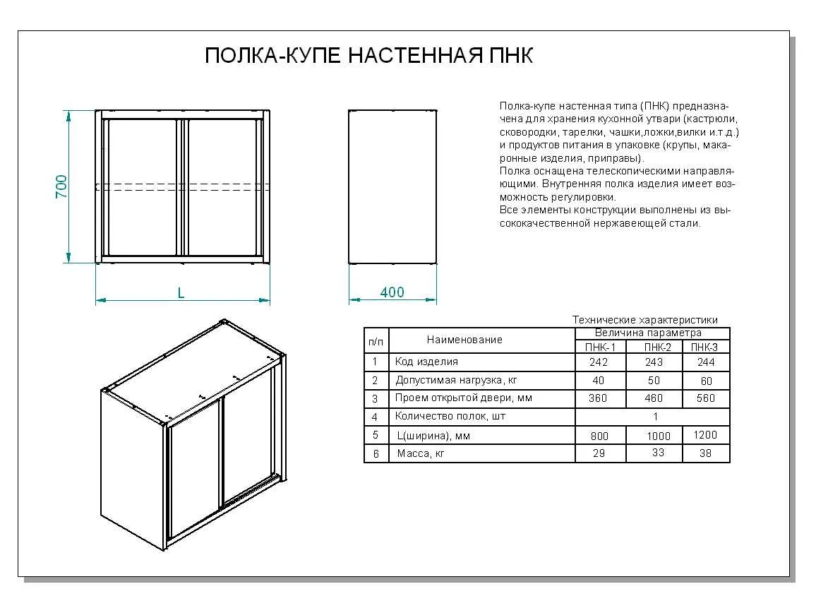 Полка-купе настенная ПНК предназначена для хранения кухонной утвари (кастрюли, сковородки, тарелки, чашки, ложки, вилки и т.д.) и продуктов питания в упаковке (крупы, макаронные изделия, приправы).