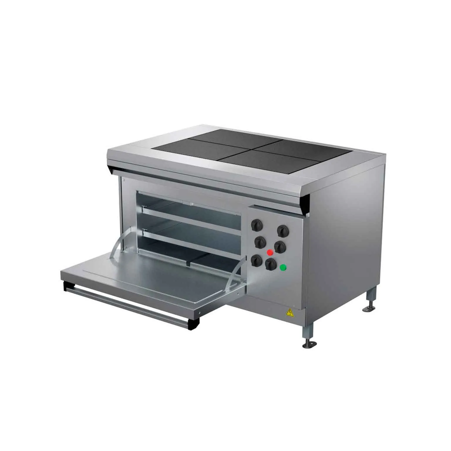 Эл.плита П-0,48ШП-03 4-х конфорочная с жарочным шкафом используется на предприятиях общественного питания и торговли для приготовления первых, вторых и третьих блюд в наплитной посуде, а также для жарки полуфабрикатов из мяса, рыбы, овощей. Каркас изготовлен из черного металла с полимерным покрытием, рабочий стол - из нержавеющей стали, облицовки - из углеродистой стали.
